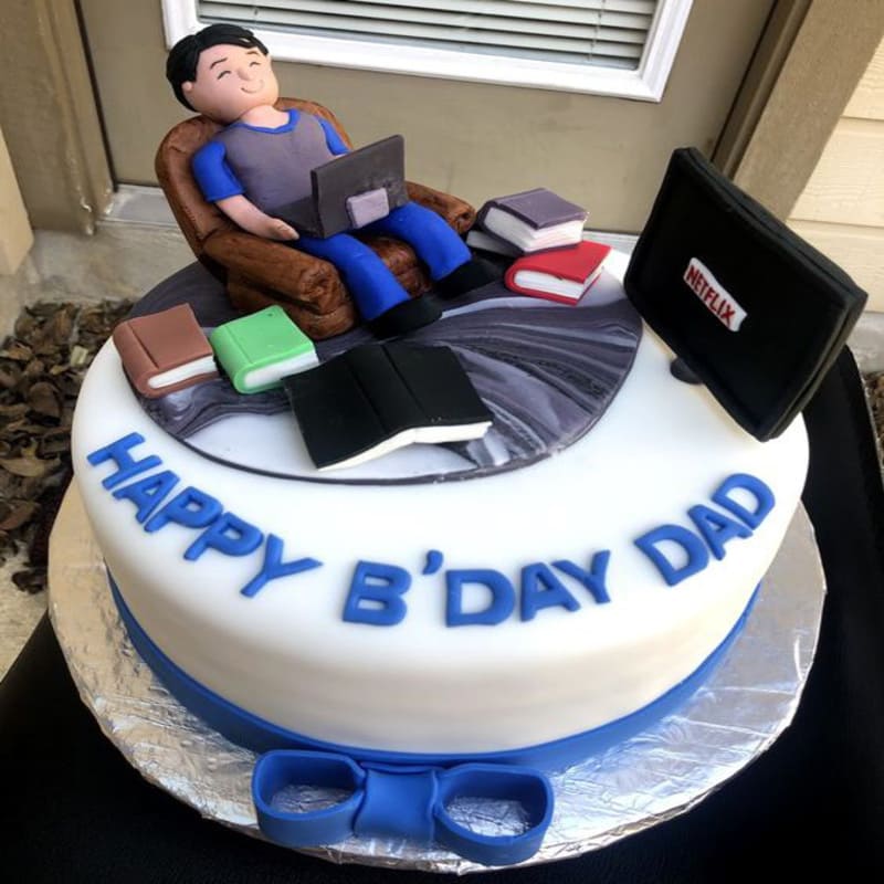 The cake is made with layers of moist vanilla sponge cake, filled with rich and creamy chocolate ganache, and frosted with smooth buttercream frosting. The top of the cake is decorated with a fondant figurine of a dad sitting at his desk, surrounded by work-related props such as a laptop, files, and a coffee cup. The figurine is handcrafted with attention to detail, making it a perfect representation of your dad’s daily routine.